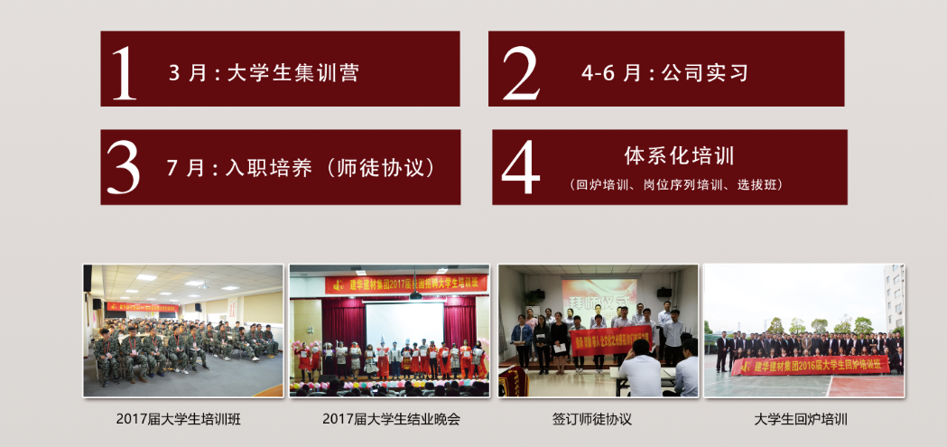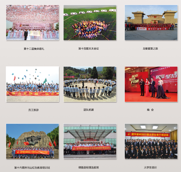 自2002年起,建华建材每年都在全国部分高校招收大量的优秀毕业生,开展大学生就业集训营活动,并由专职老师讲解有关就业指导、职业素养、社交礼仪、企业文化等课程,使其尽快完成由学生往社会人、企业人的转变。2018届大学生培训计划: