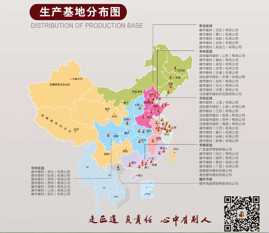 截止到 2017 年 6月 ,建华建材集团在国内 17 个省(广东、福建、江苏、安徽、湖北、河南、湖南、山西、山东、辽宁、吉林、河北、四川、黑龙江、江西、浙江、陕西)2 个直辖市(上海、天津)和 1 个自治区(广西)成立并投产了 37 处管桩生产基地(含100条管桩生产线)。紧紧抓住“长三角”、“珠三角”、“环渤海湾”三大区域经济增长点,在全国设有257个销售服务网点,覆盖全国大部分区域。在加大全国布点,抢占市场制高点的同时,建华建材积极探索国外市场,并于 2012 年在越南成立了海外公司,阔步走向世界。通过沿海沿江生产基地自建码头,产品销售可覆盖东南亚及周边各国。