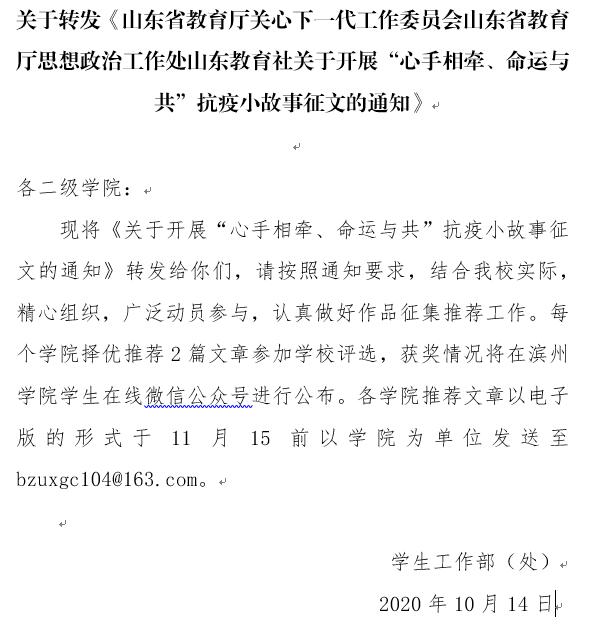 关于转发《山东省教育厅关心下一代工作委员会山东省教育厅思想政治工作处山东教育社关于开展“心手相牵、命运与共”抗疫小故事征文的通知》