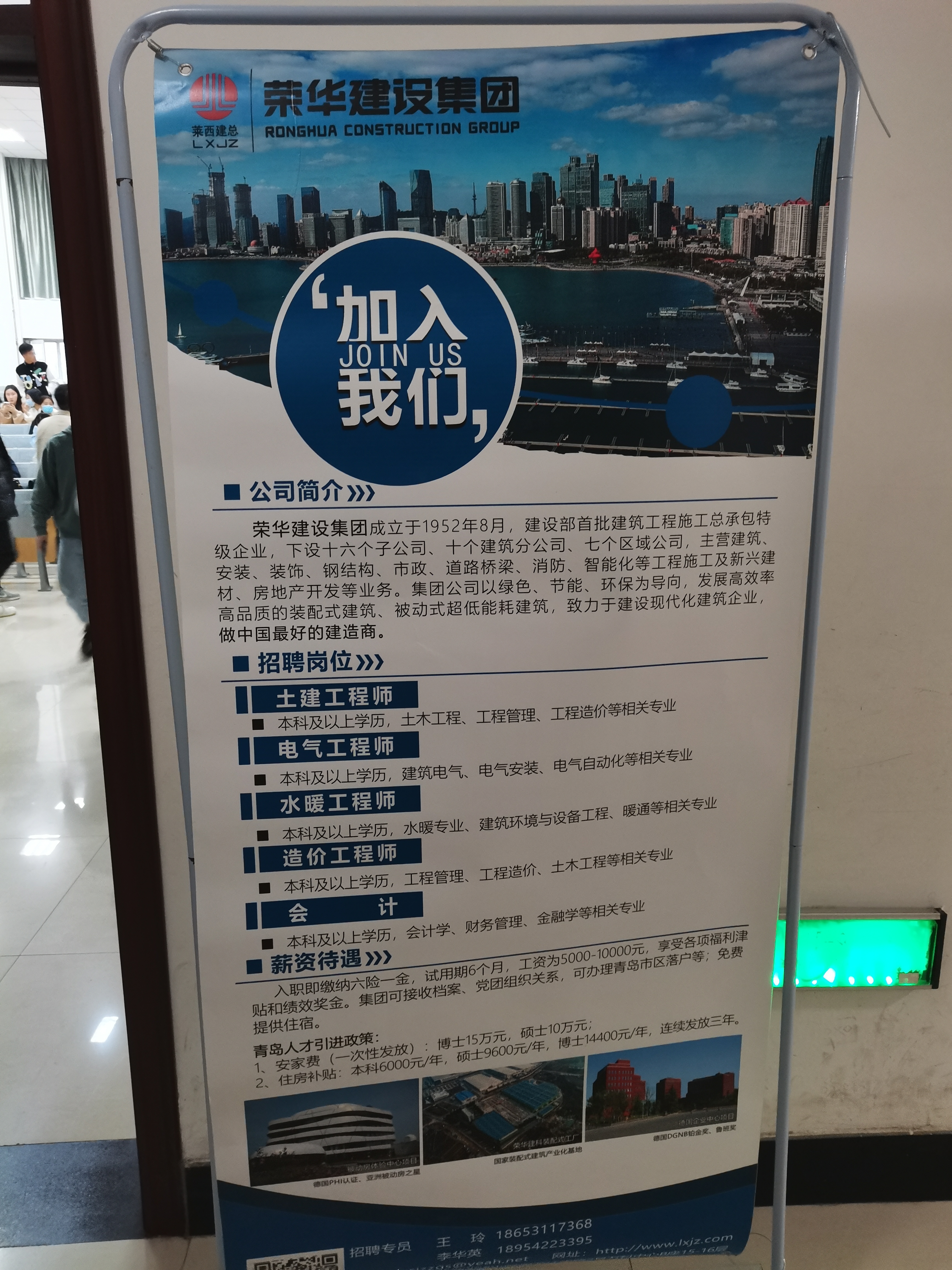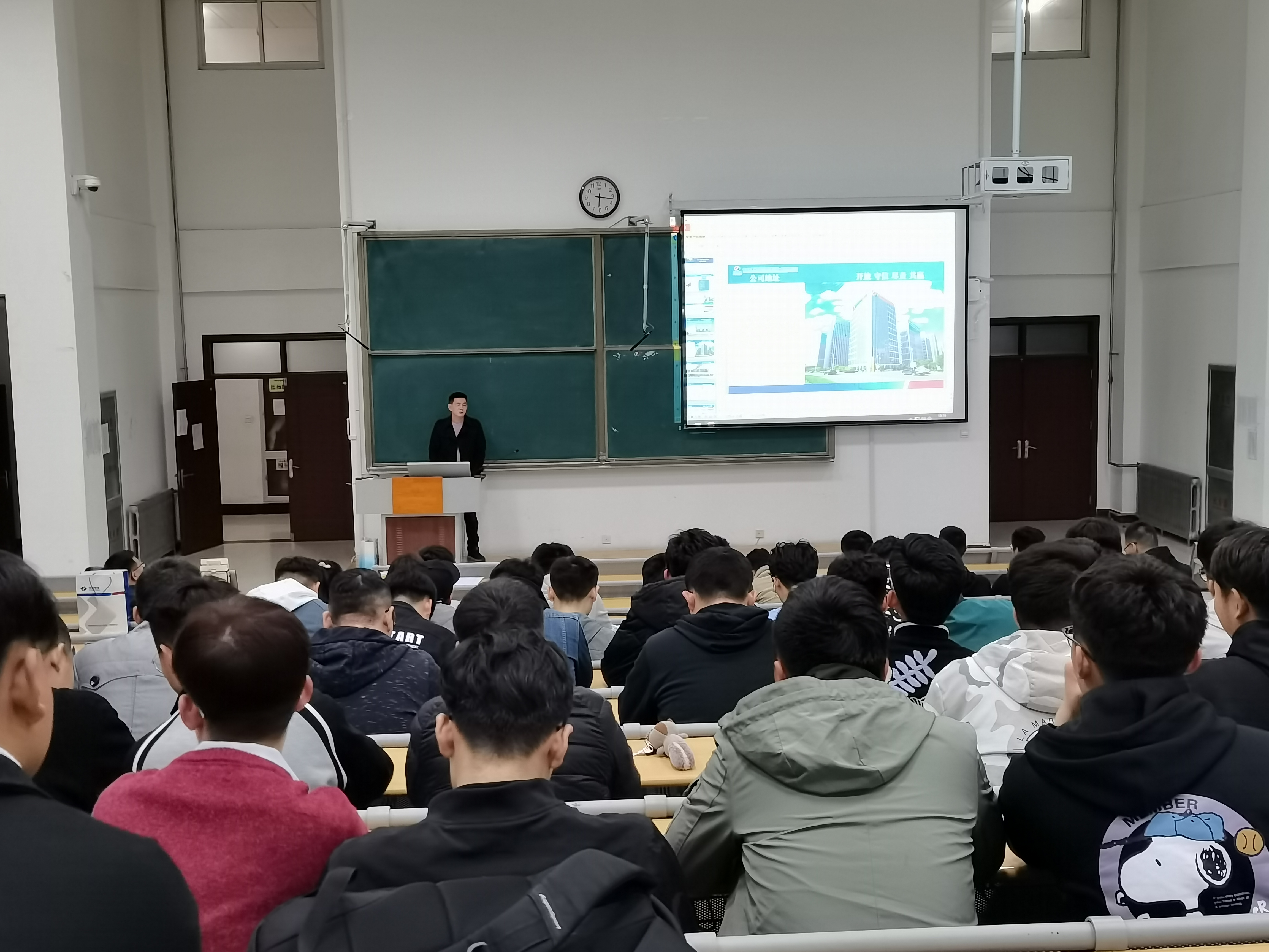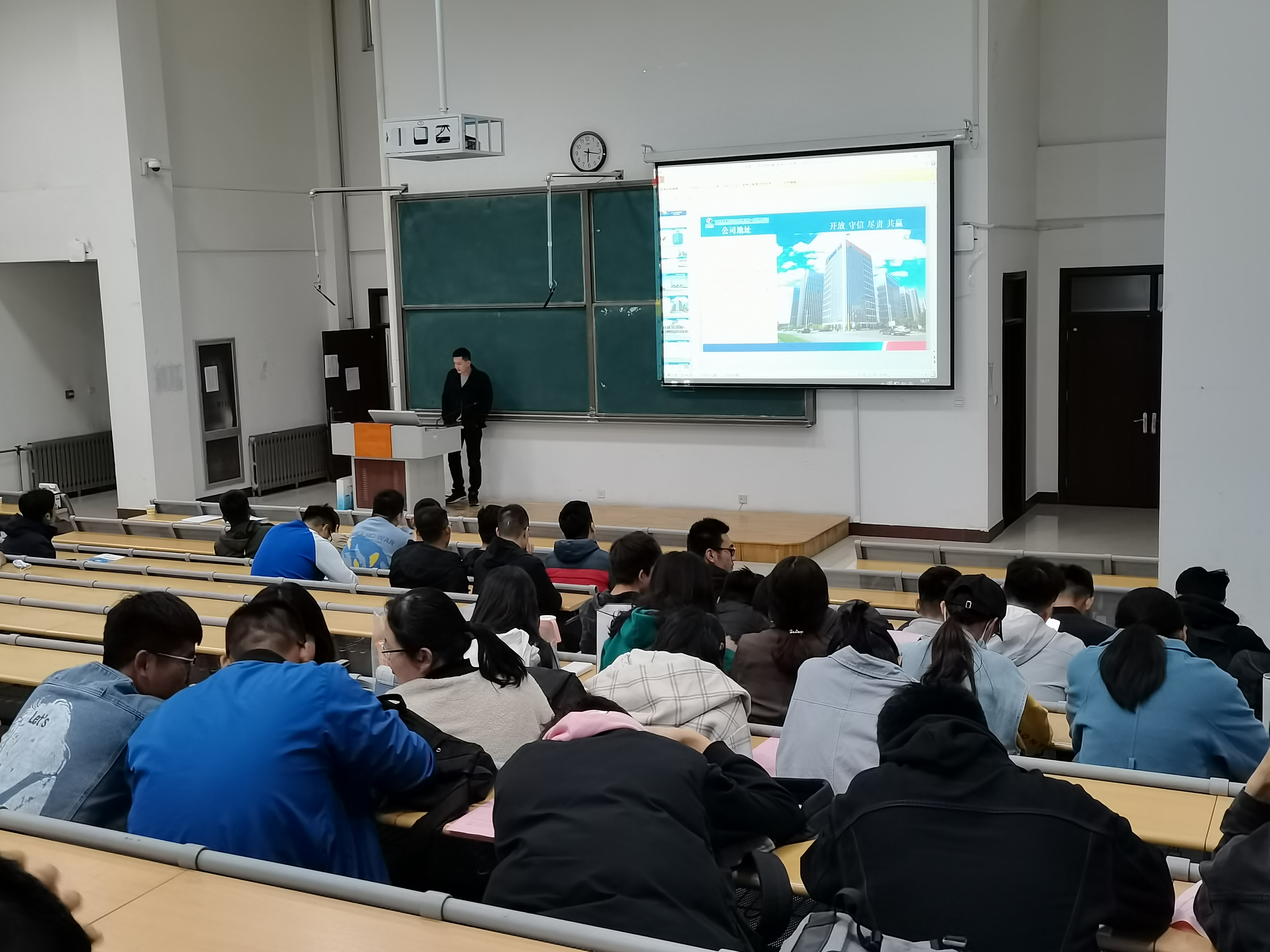 首先,中国电建山东一公司和荣华建设集团招聘负责人分别详细介绍了公司的基本情况、主营业务等,对招聘岗位、岗位要求、薪资待遇以及发展前景等方面进行了细致地宣讲。随后,同学们对自己感兴趣的问题进行提问,企业负责人进行了耐心地解答,双方进行了充分沟通,同学们对企业有了更全面的了解。