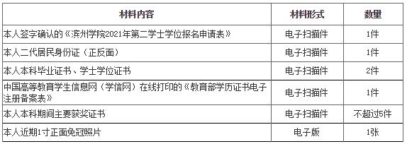 (2)《滨州学院2021年第二学士学位报名申请表》(请在滨州学院招生就业网对应文件处下载后填写)。1寸照片应为本人近期正面免冠彩色照片,人像要求在图像矩形框内水平居中,左右对称,清晰度高,白色背景为佳。
