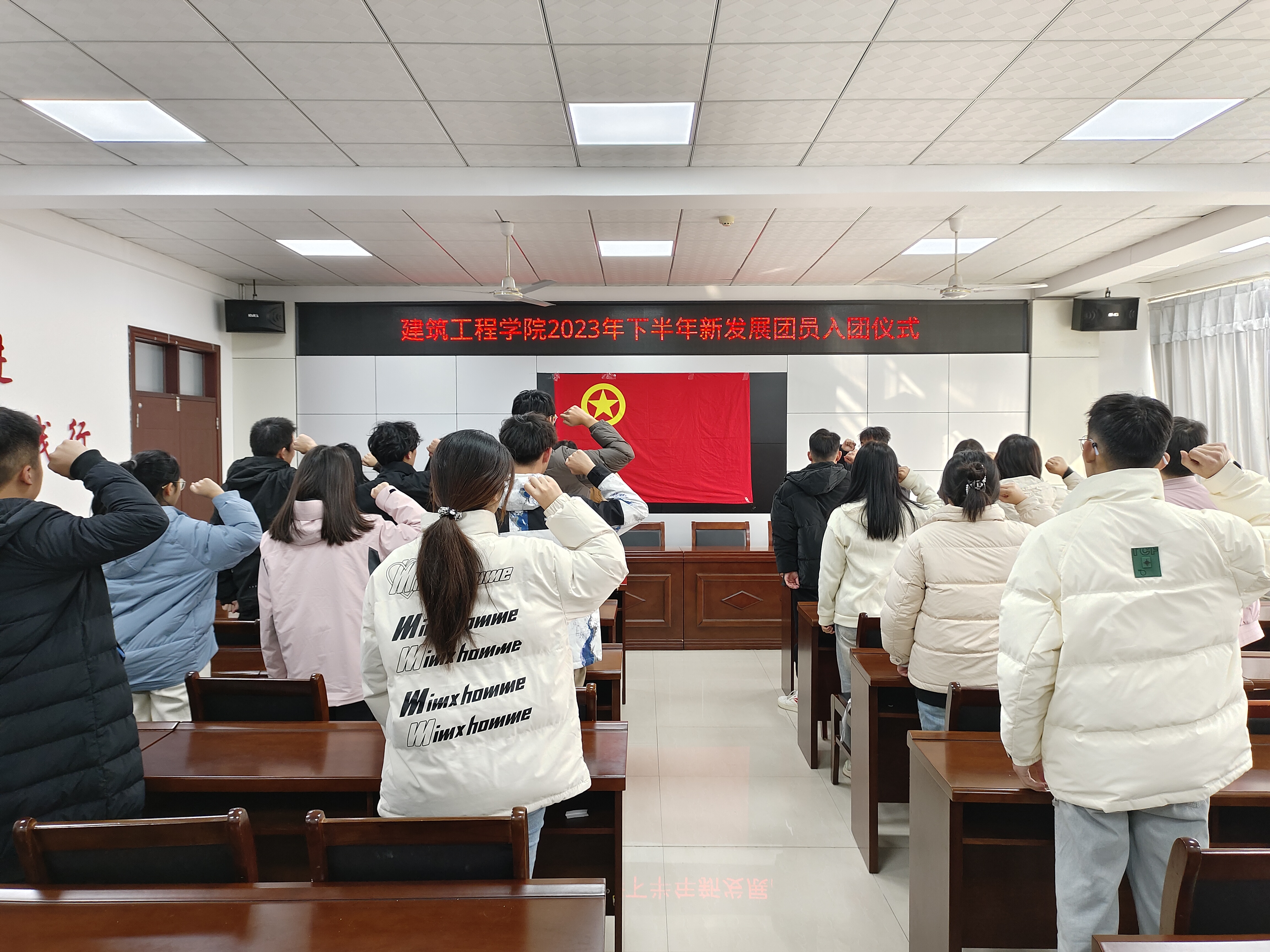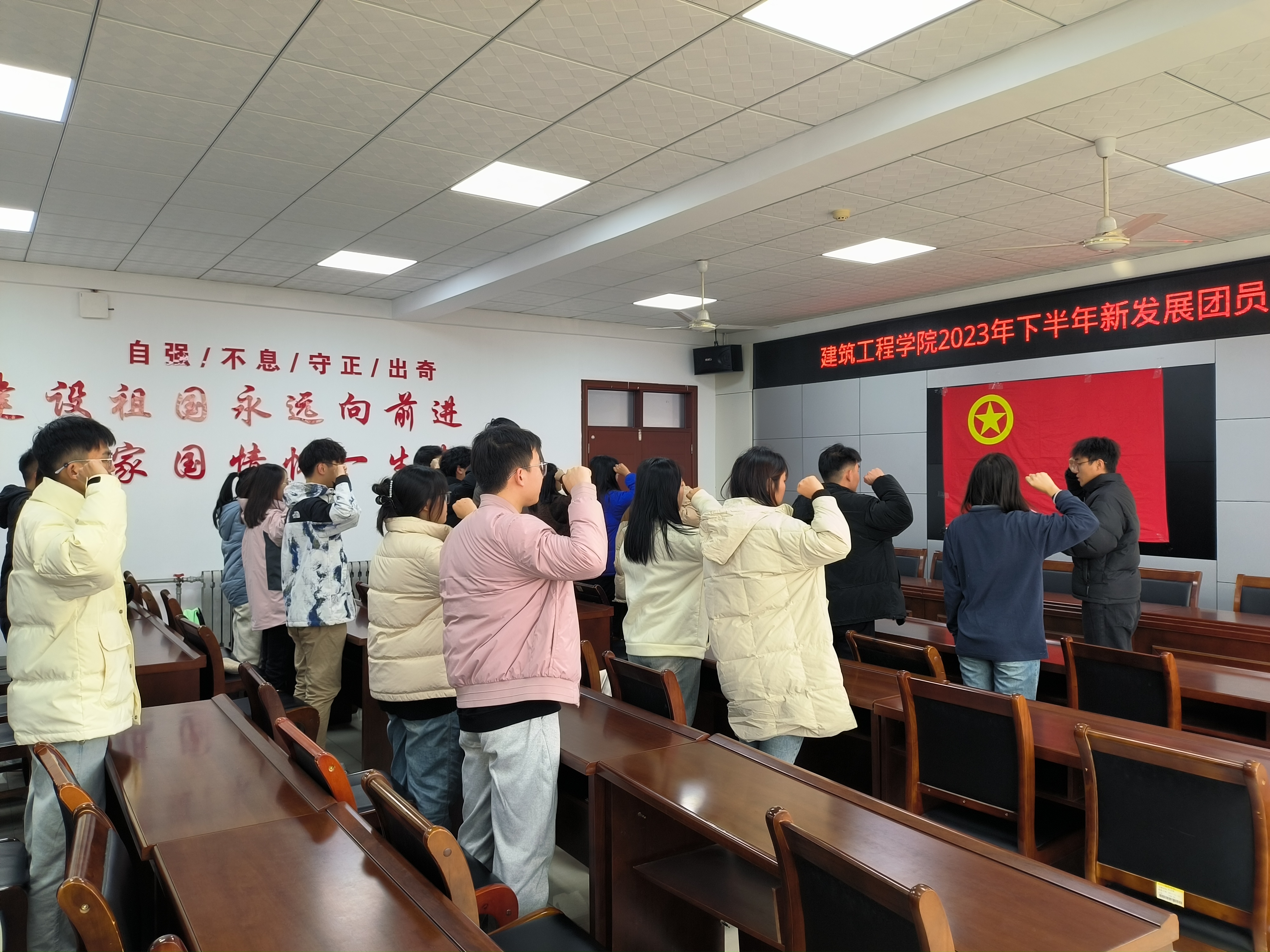 随后,全体新团员面向团旗庄严宣誓,时刻谨记作为一名共青团员的权利和义务,勇做新时代有理想、有本领、有担当的有为青年,在社会主义现代化强国建设和民族复兴伟业中挺膺担当。